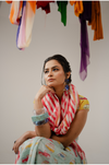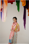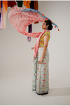 h Playful and carefree, Fiesta is the saree that turns every day into a celebration. Crafted in airy Chanderi, this half-and-half drape pairs a refreshing mint base with a striking fuchsia pink striped pallu that brings instant cheer. Adorned with quirky hand block printed campervan motifs, Fiesta is a nod to wanderlust and the joy of living spontaneously. Finished with beautiful handmade tassels, this saree is for the free spirit who loves to laugh louder, travel farther, and dance longer.