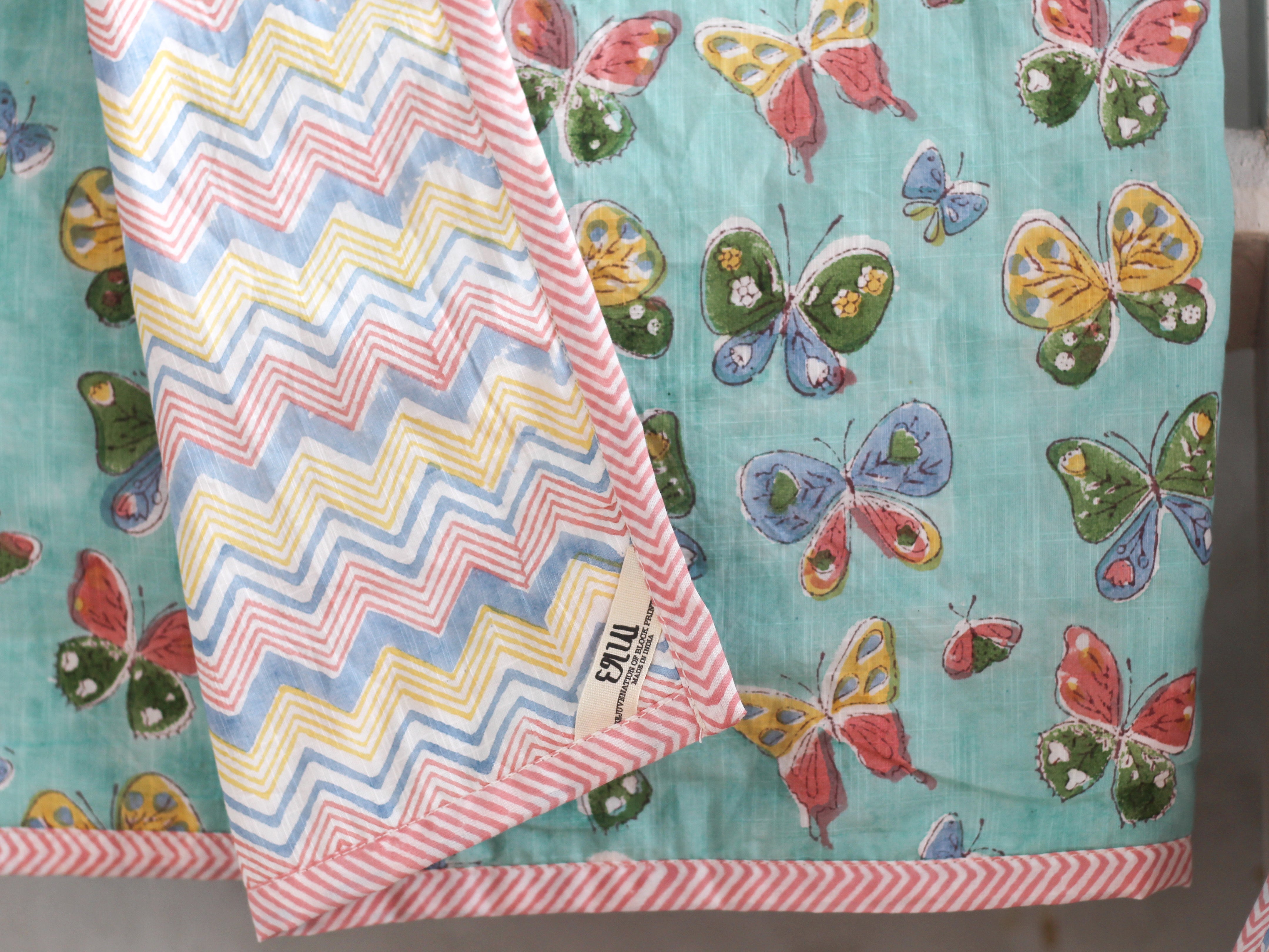 Our reversible single-bed quilts with unique and cute prints will bring a breath of fresh air to your abode. Its soothing mint colour adds an element of softness, while the Butterflies create a sense of adventure and whimsy. Also The backside chevrons pattern on the other side adds to the beauty of this stunning quilt.