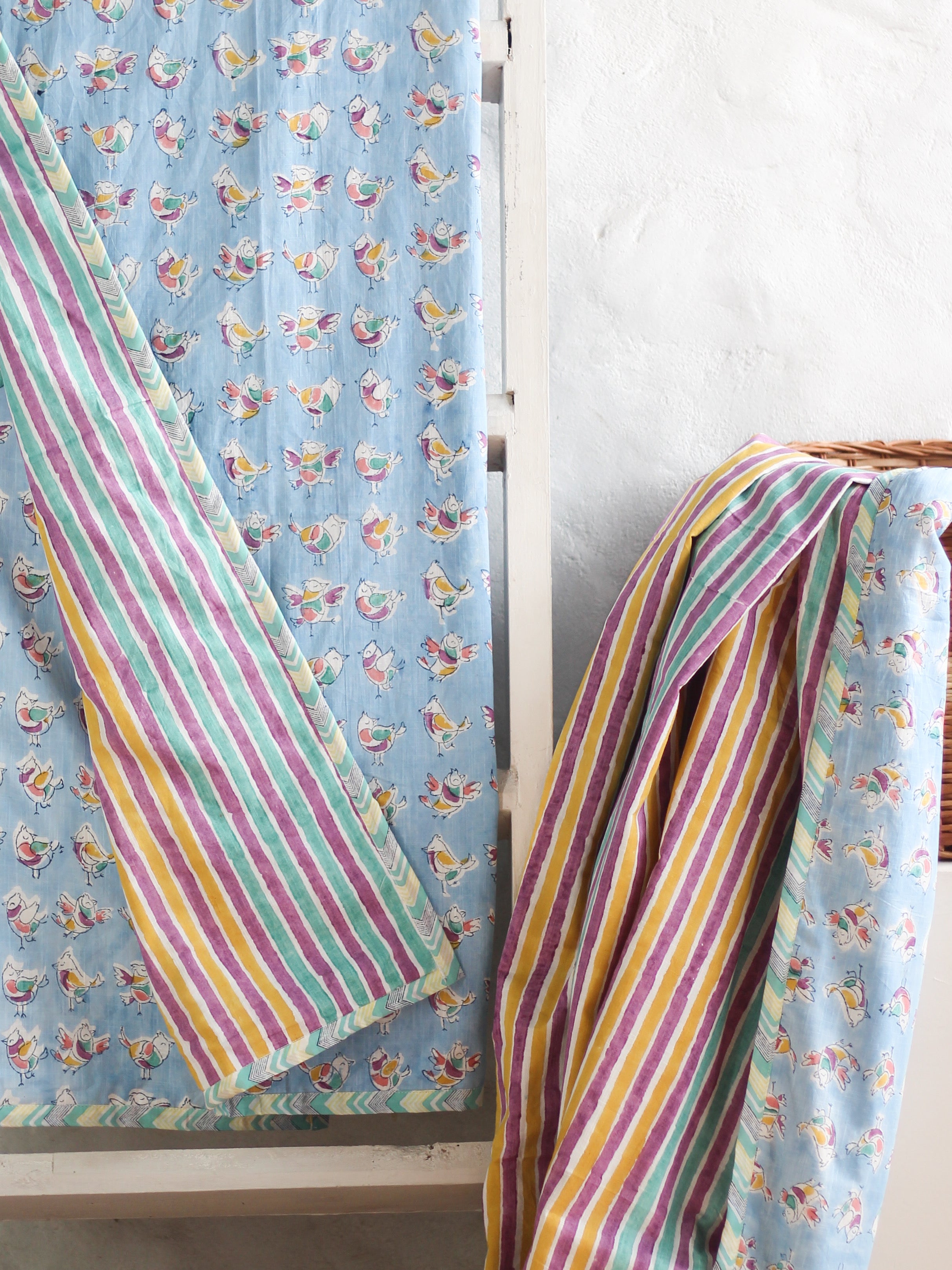 Our reversible single-bed quilts with unique and cute prints will bring a breath of fresh air to your abode. Its soothing skyblue colour adds an element of softness, while the Birdies create a sense of adventure and whimsy. Also The backside pattern on the other side adds to the beauty of this stunning quilt.
