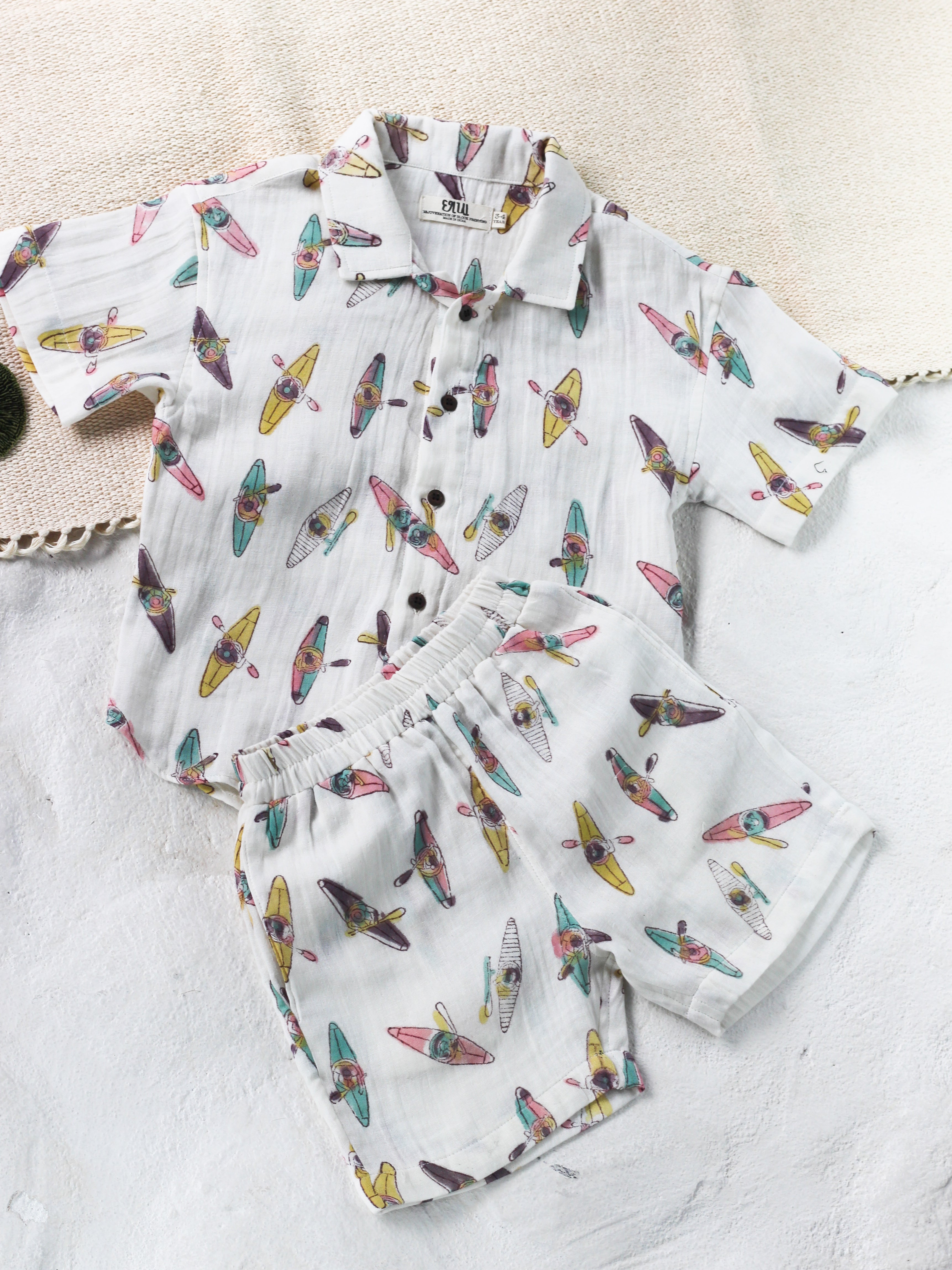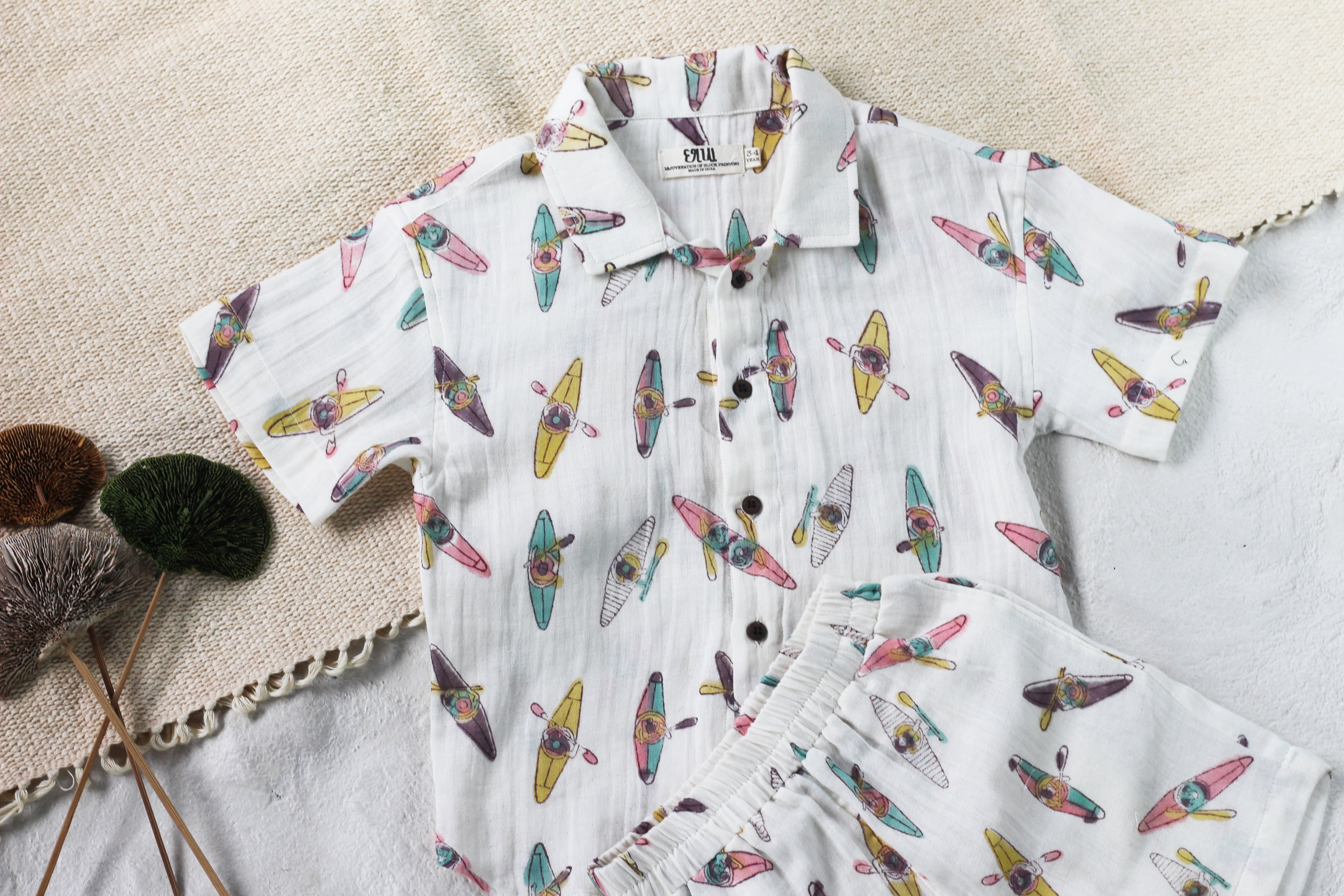 Let your little adventurer paddle through the day in style! This charming muslin set features hand block printed kayaking doodles in soft pastels, perfect for young explorers who love the water. The super comfy loose fit ensures freedom to move and play, while the breathable muslin fabric keeps them cool and cozy all day long. Complete with a matching shirt and shorts, it's the ideal outfit for summer adventures, casual outings, or lazy afternoons at home.
