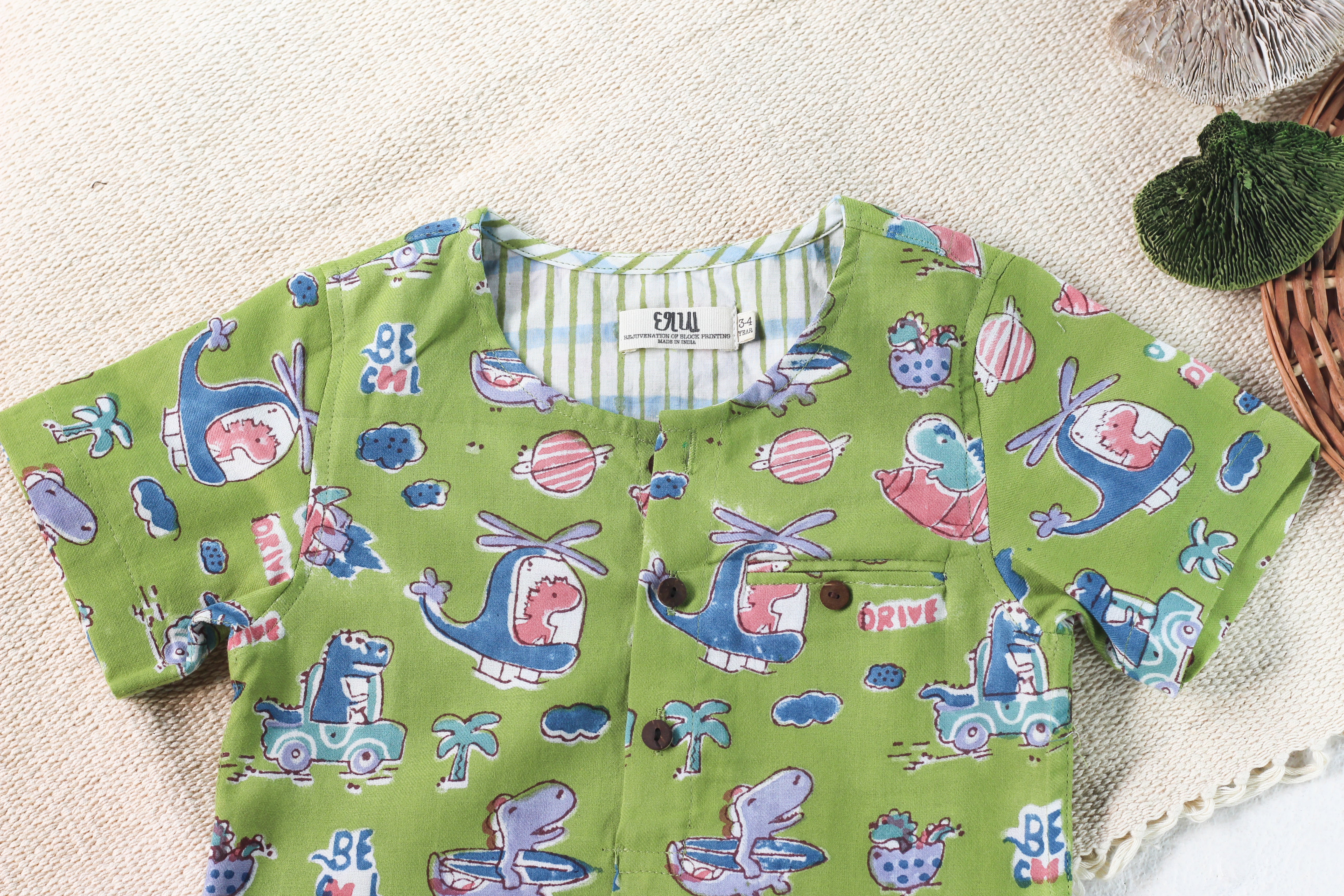 Your little explorer will love this playful dino adventure set! Crafted from soft cotton in a cheerful green shade, this hand block printed ensemble features adorable space-themed dinosaurs that spark imagination. The set includes a matching top and shorts designed with a comfy loose fit, perfect for active kids who need room to move and play. Gentle on skin and easy to care for, it's the ideal outfit for everyday fun and outdoor adventures.