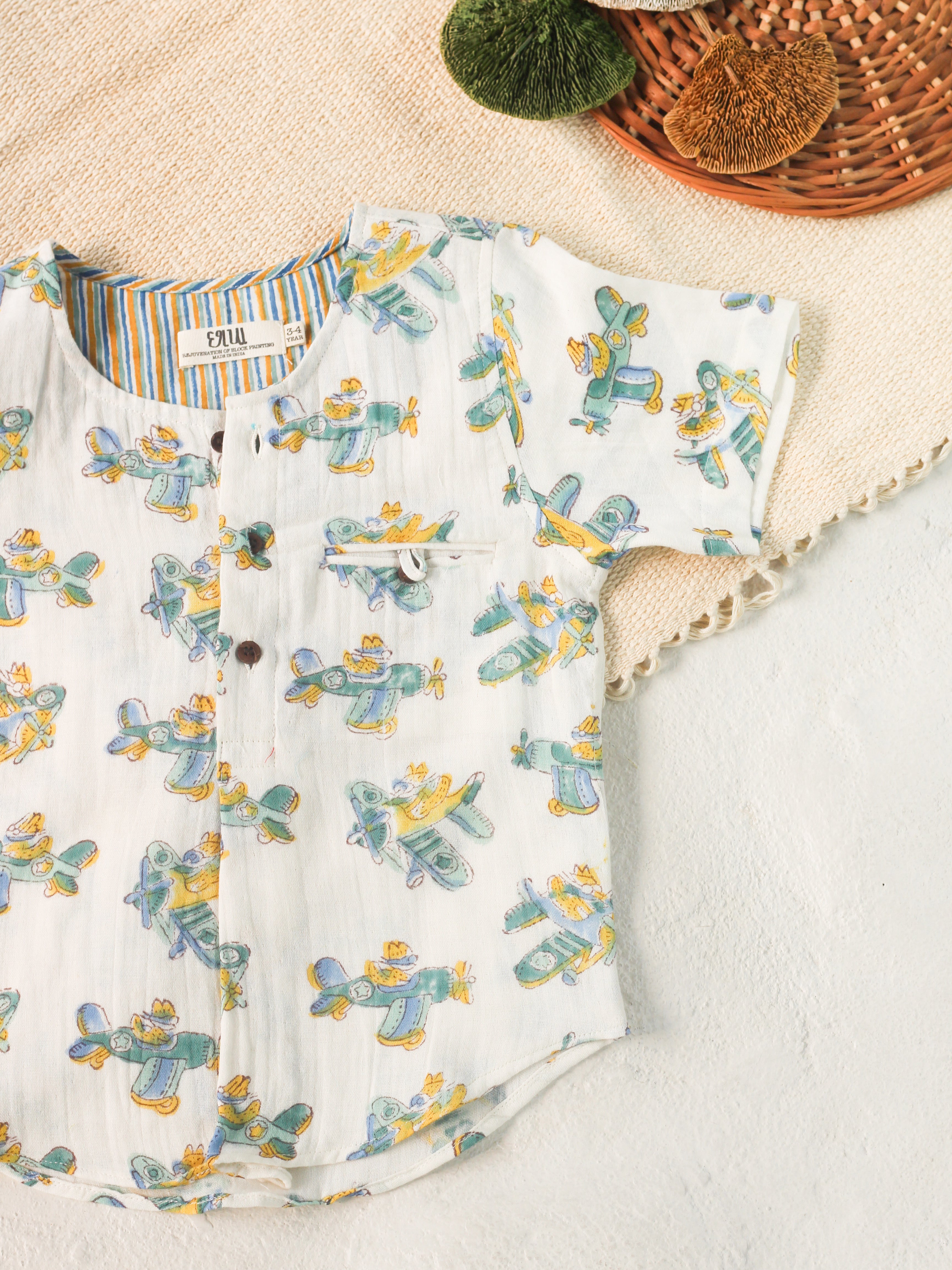 Let your little one soar in style with this delightful muslin set featuring whimsical plane doodles. Crafted from soft, breathable muslin in a soothing white pastel shade, this hand block printed ensemble includes a relaxed-fit shirt paired with matching shorts—perfect for keeping kids cool and comfy all day long. The playful aviation theme makes getting dressed an adventure!