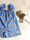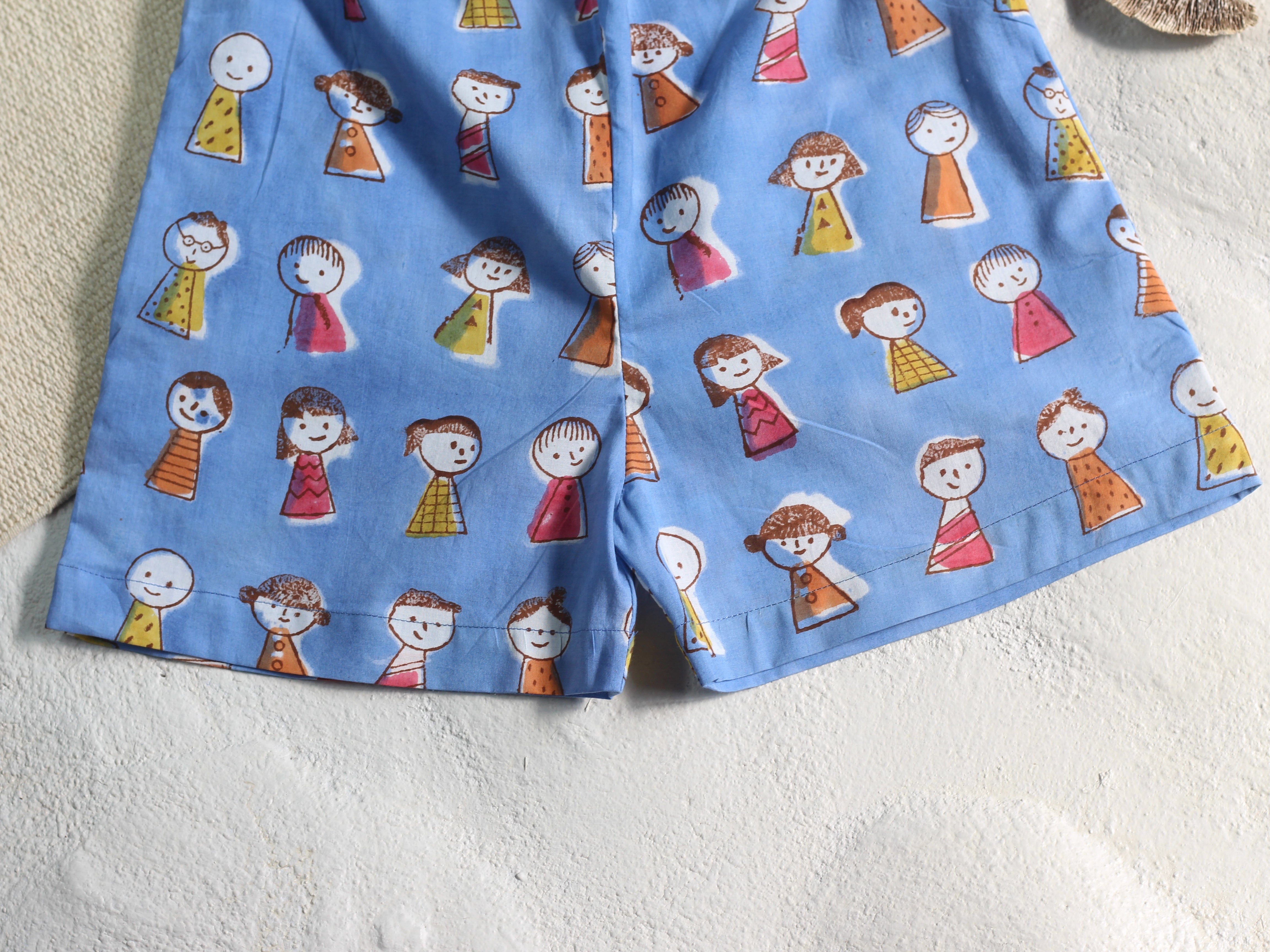 Watch imaginations come alive in this enchanting puppet jumpsuit! Dressed in a lovely blue cotton base, it's adorned with hand block printed puppet designs that spark joy and creativity. The playful frill accents dance around the edges, adding that extra sprinkle of fun. Each print is uniquely crafted using traditional techniques, ensuring no two pieces are exactly alike. Comfortable, quirky, and bursting with personality—this is the jumpsuit that turns everyday moments into magical adventures.