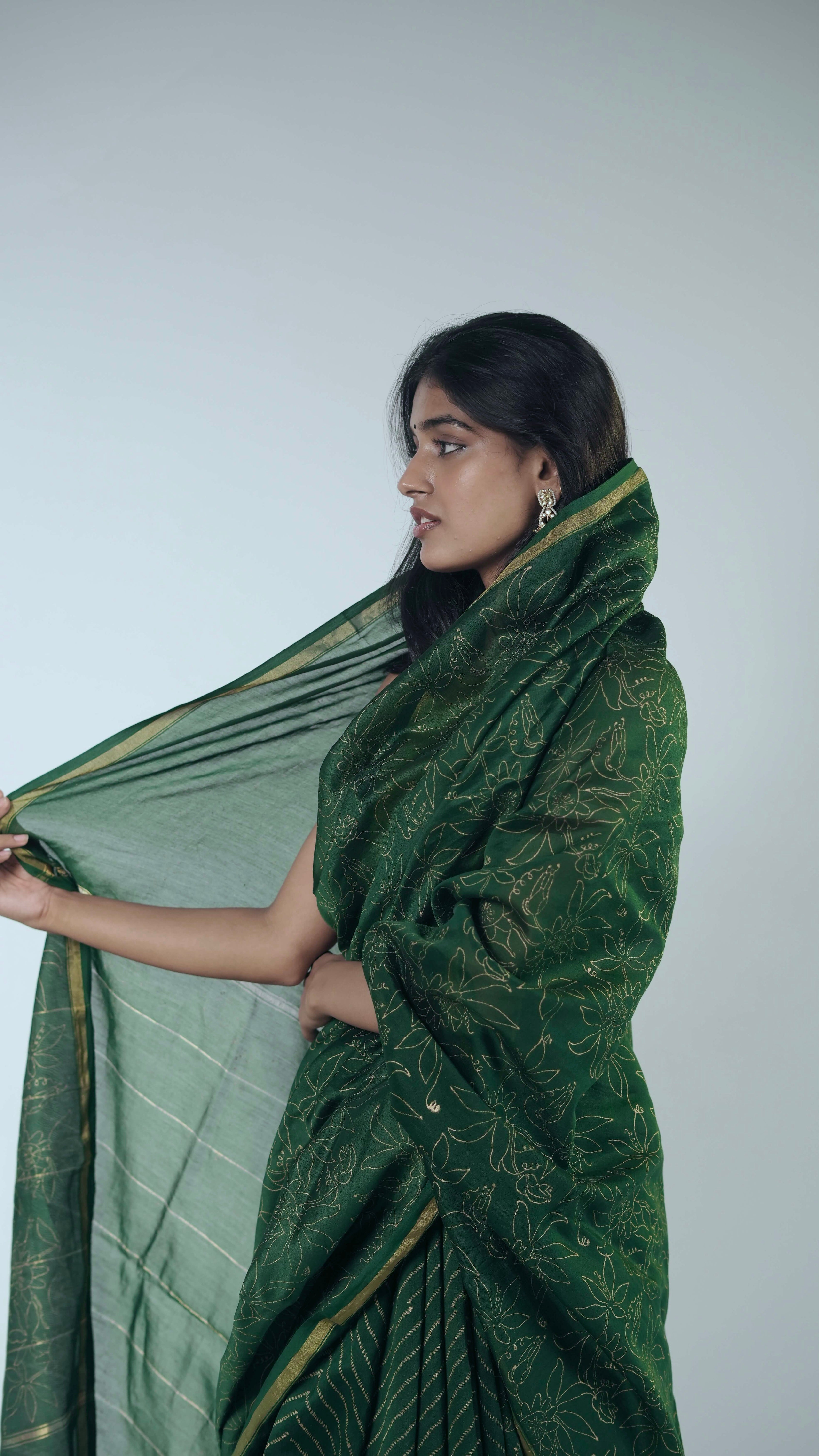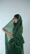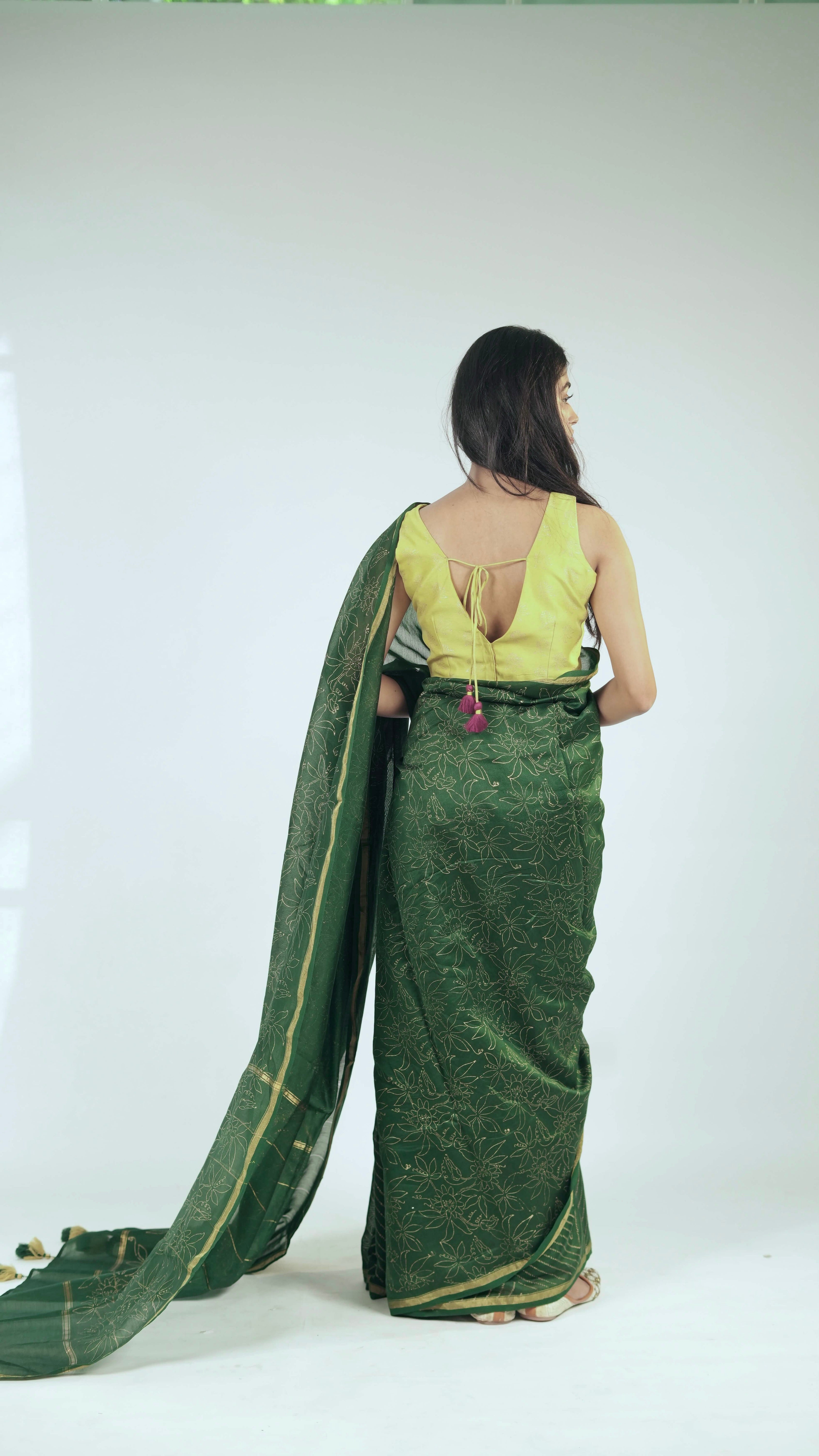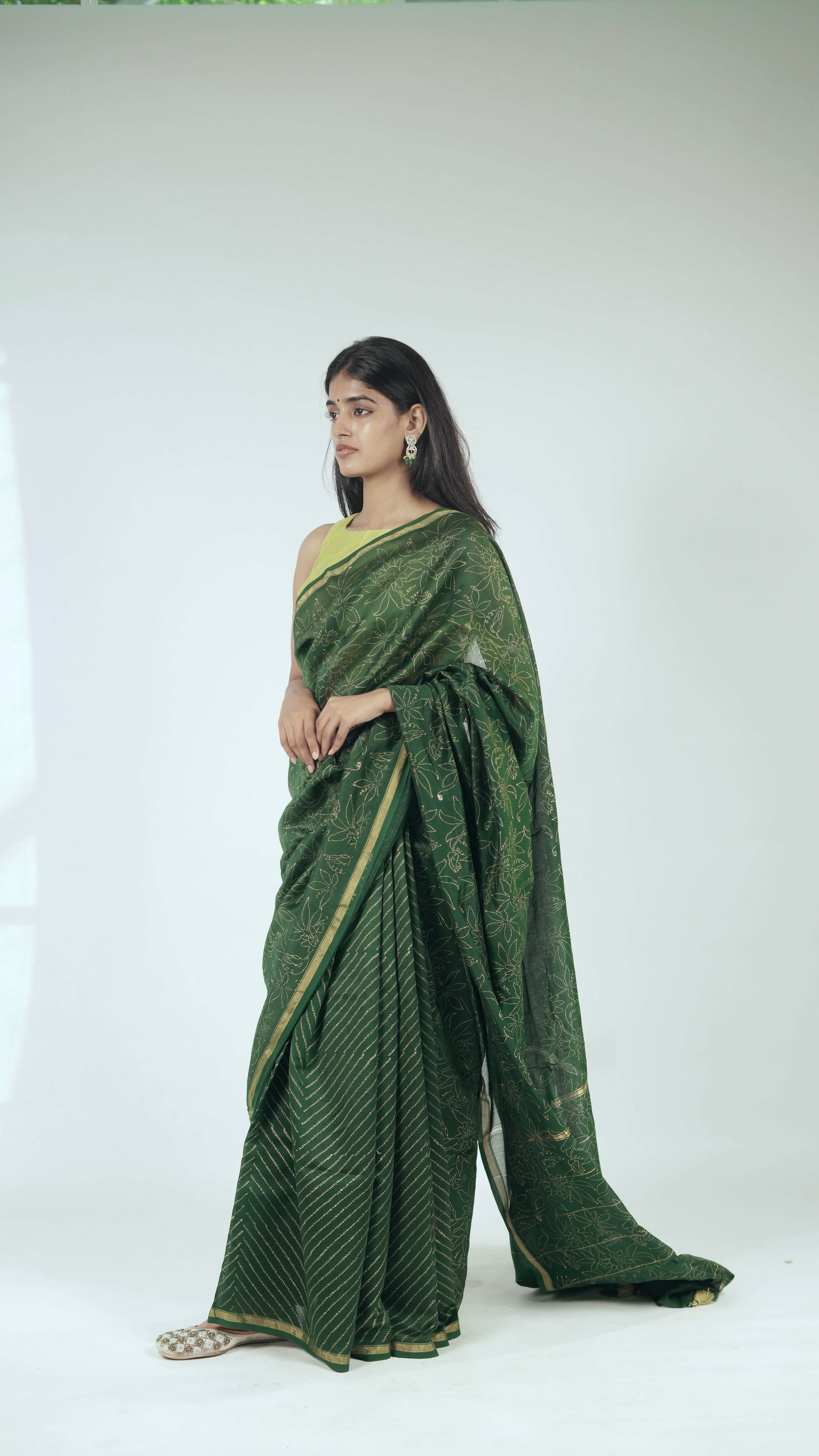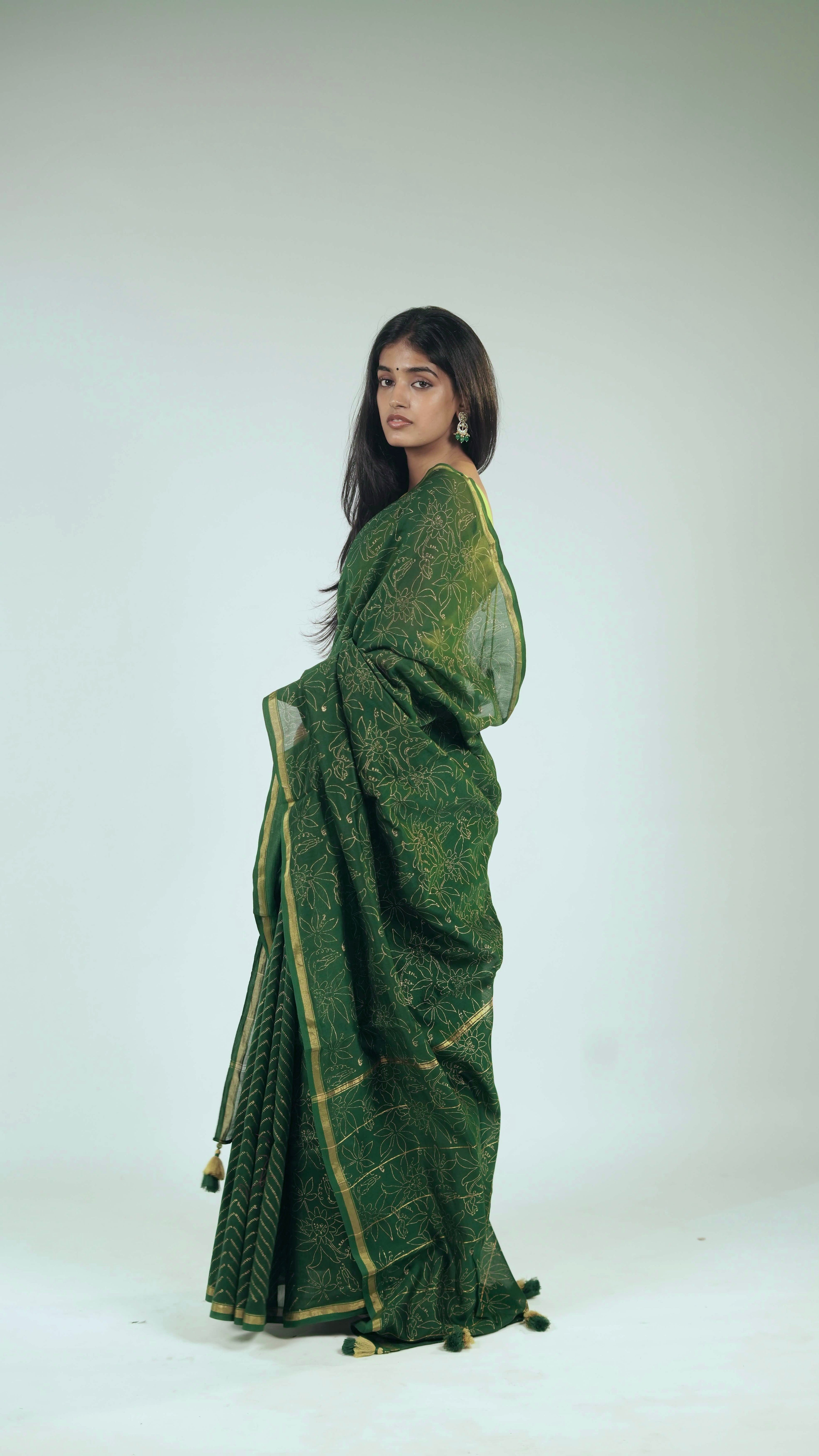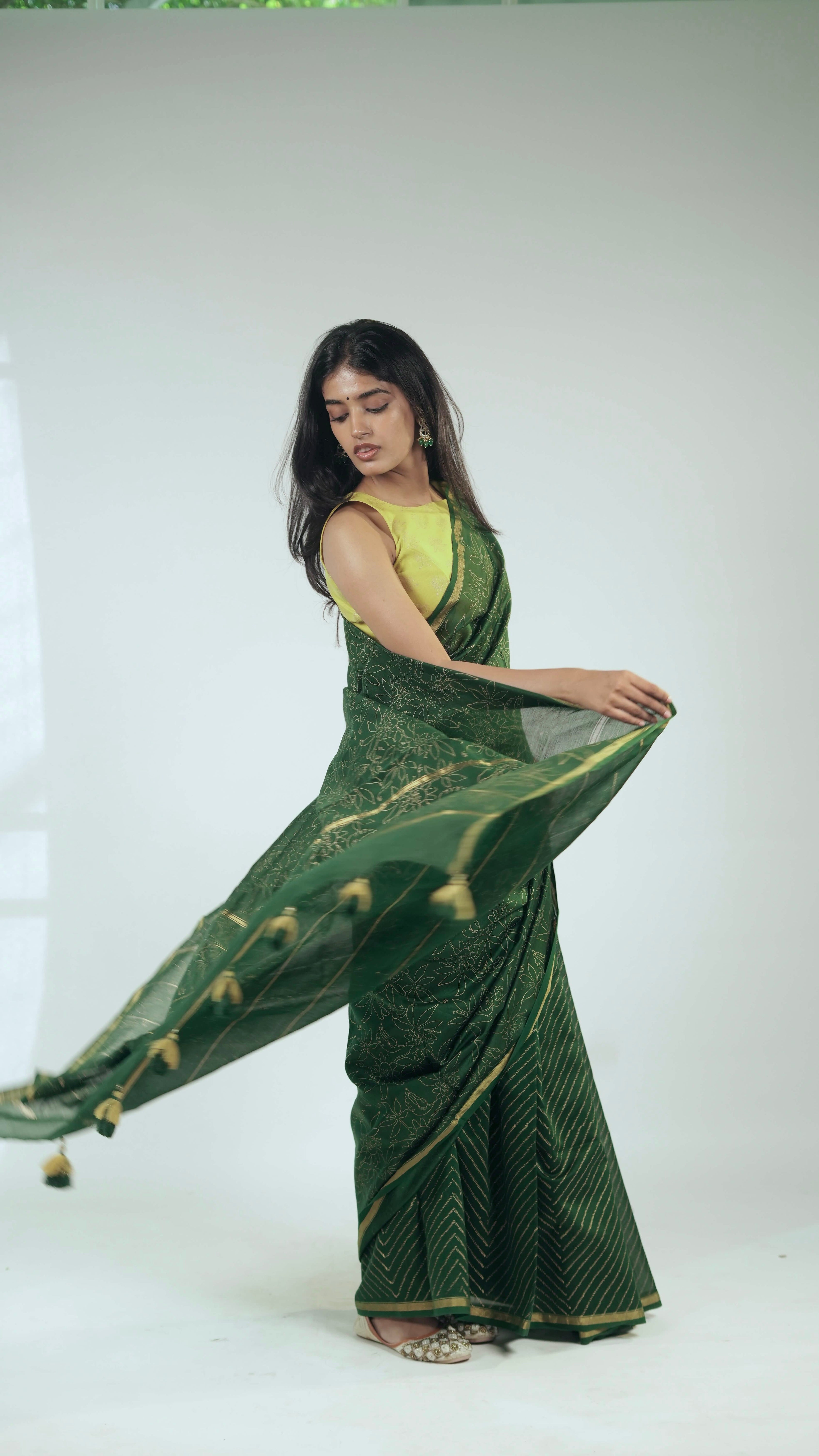 Inspired by divine gardens, Hariyali blooms with Krishna jaal motifs on lush green Chanderi. Gold foil details sparkle like festive lights, while the flowy silhouette with tassels makes it a joyful ode to tradition and celebration.