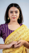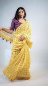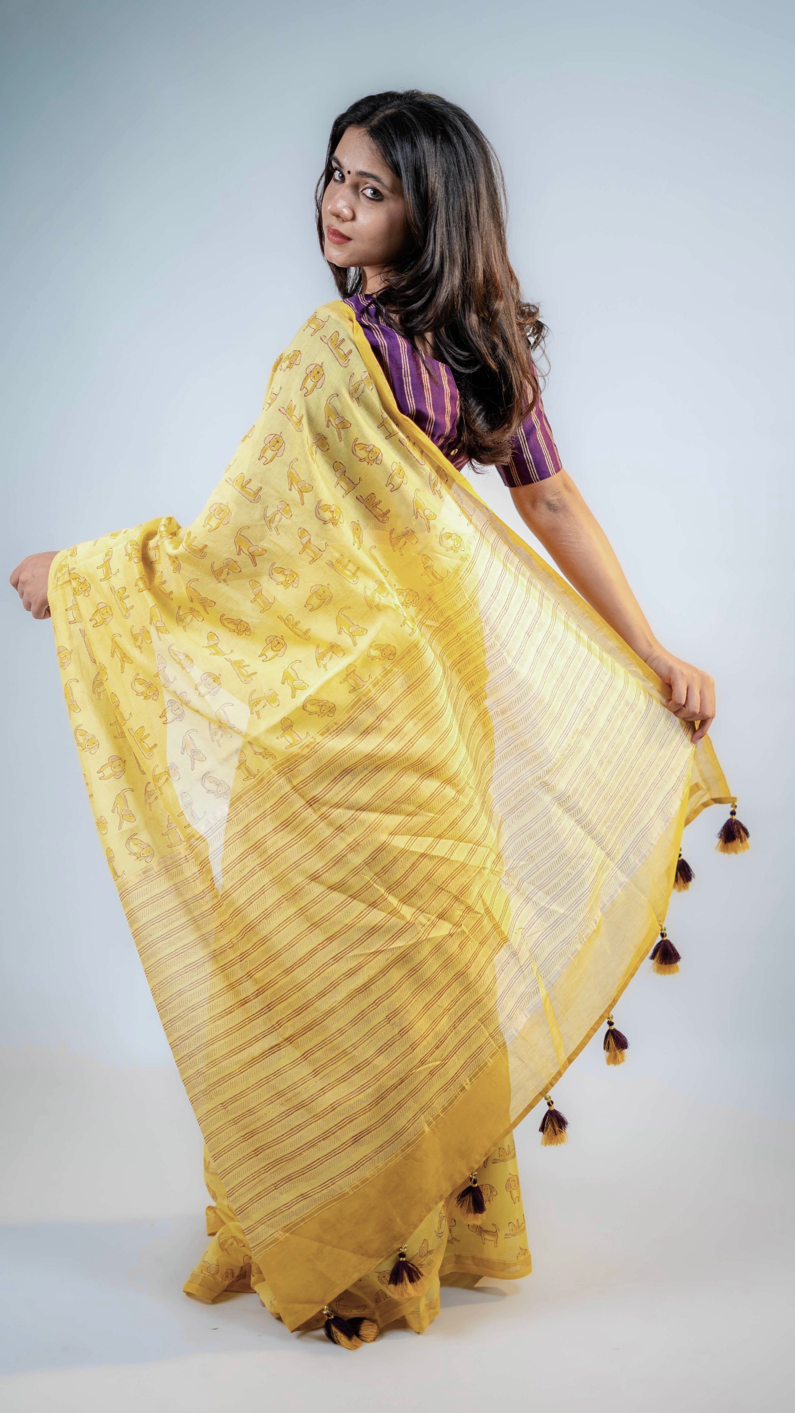 A playful twist to festive elegance, Mitwaa brings cheerful dog doodles to life on vibrant yellow Chanderi. With golden foil glints and tassels that sway with joy, this saree celebrates the bonds of companionship and the happiness of festivities.
