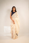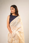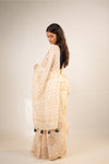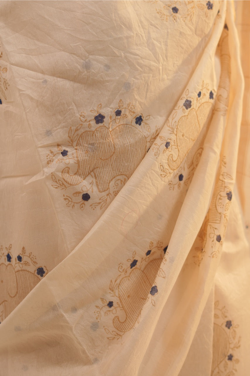 A regal celebration in white, Gajmoti brings the grandeur of elephants alive in delicate hand block prints and shimmering gold foil. The airy Chanderi drape with handmade tassels adds a festive touch, making it perfect for moments of elegance and grace this season.