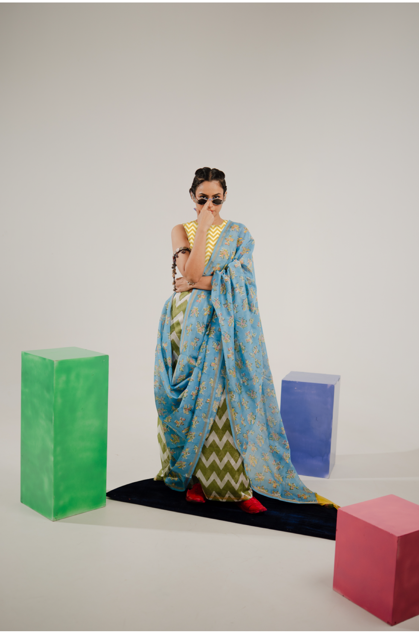 Step into nostalgia with Retro Safar, a saree that celebrates the joy of journeys and the charm of vintage travel. Woven in soft Chanderi, this half-and-half drape pairs a calming blue base with a quirky retro aeroplane pallu, detailed with Harde Lehryu stripes. The playful hand block printed aeroplane motifs capture wanderlust, while the handmade tassels add movement and whimsy. Retro Safar is for the dreamers, explorers, and free spirits who believe style is an adventure.