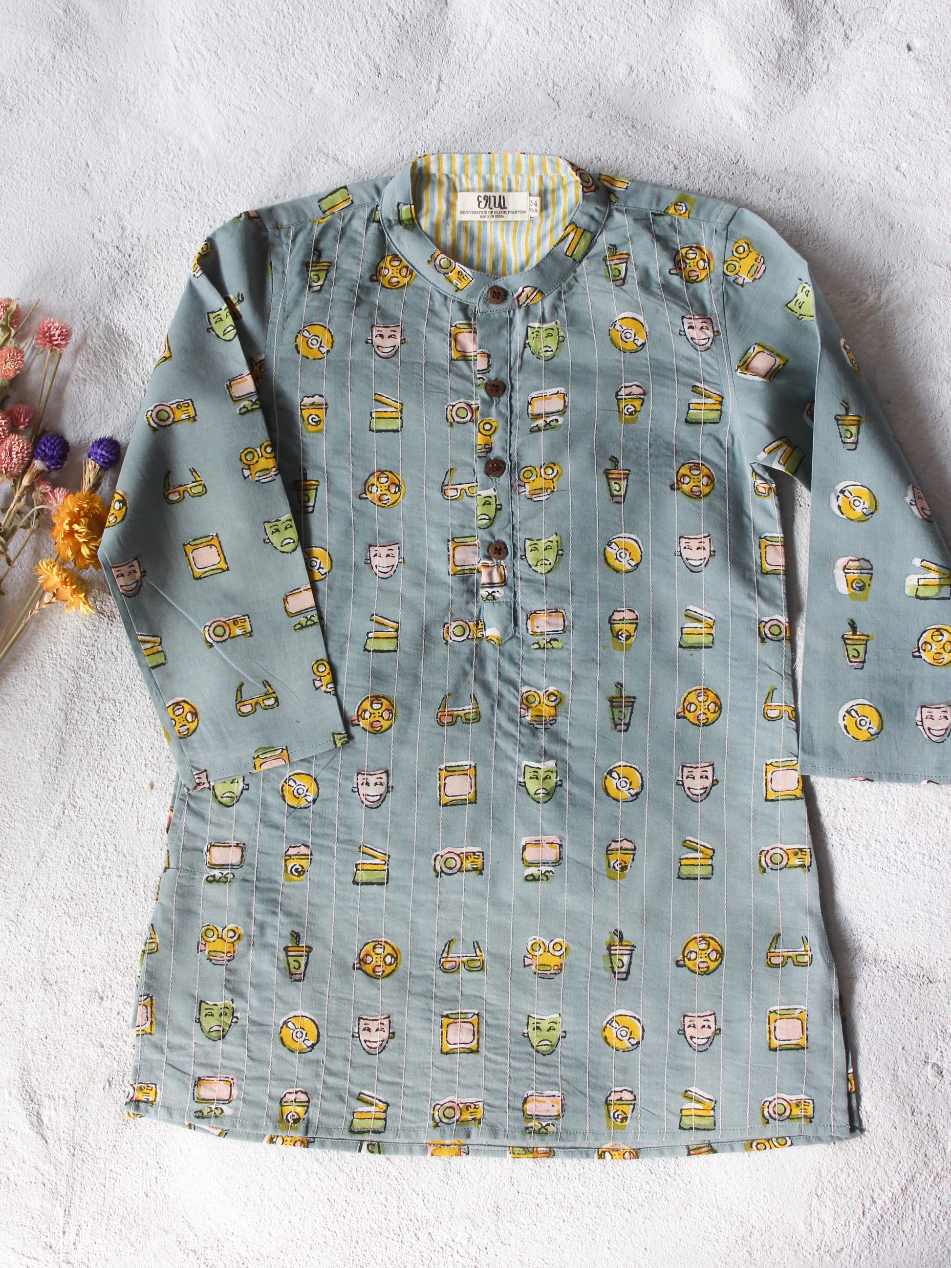 A fun and colourful kurta for your little one! With a charming cinema print, soothing gray colour and soft fabric, this essential piece goes perfectly with any outfit.