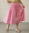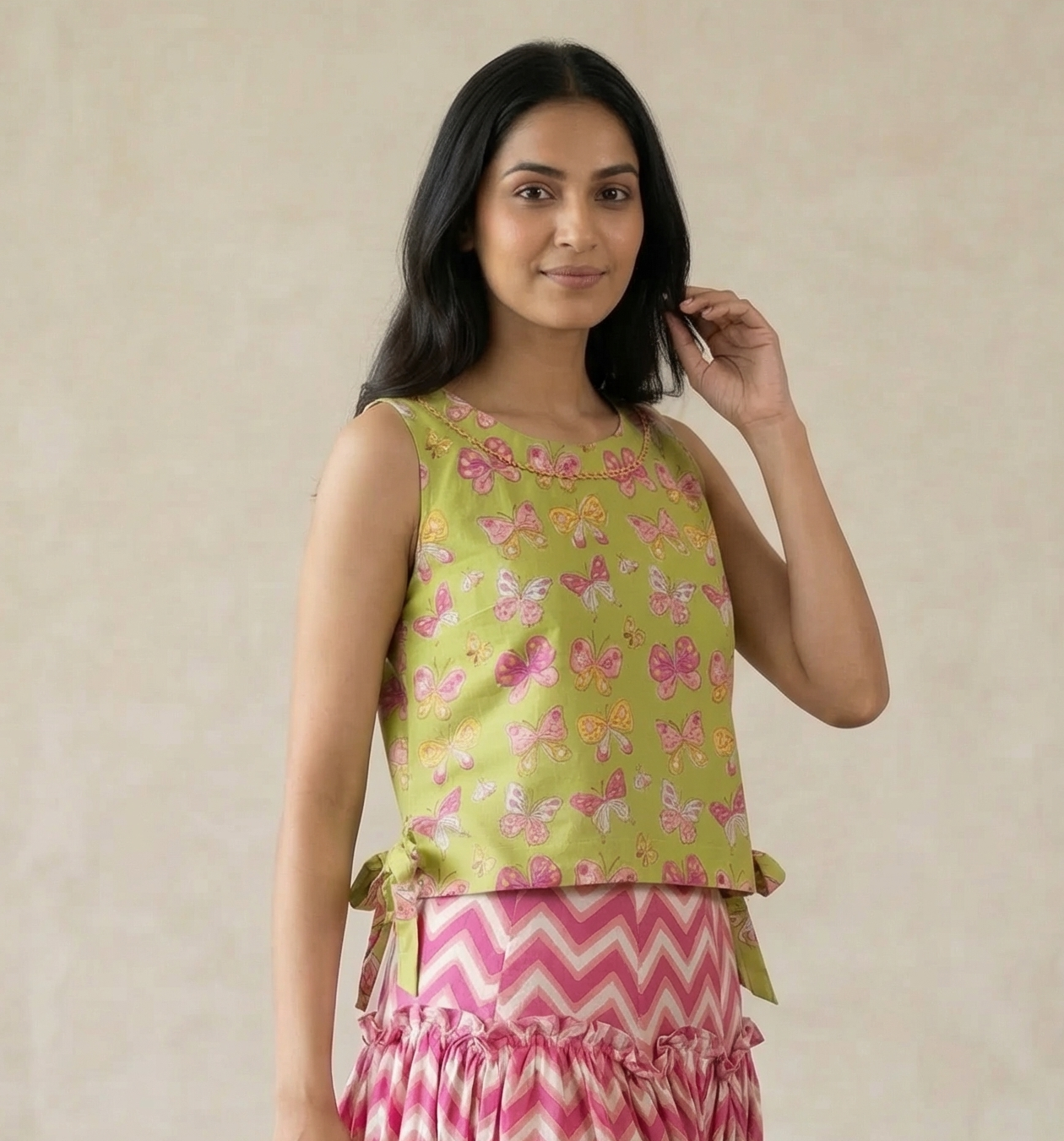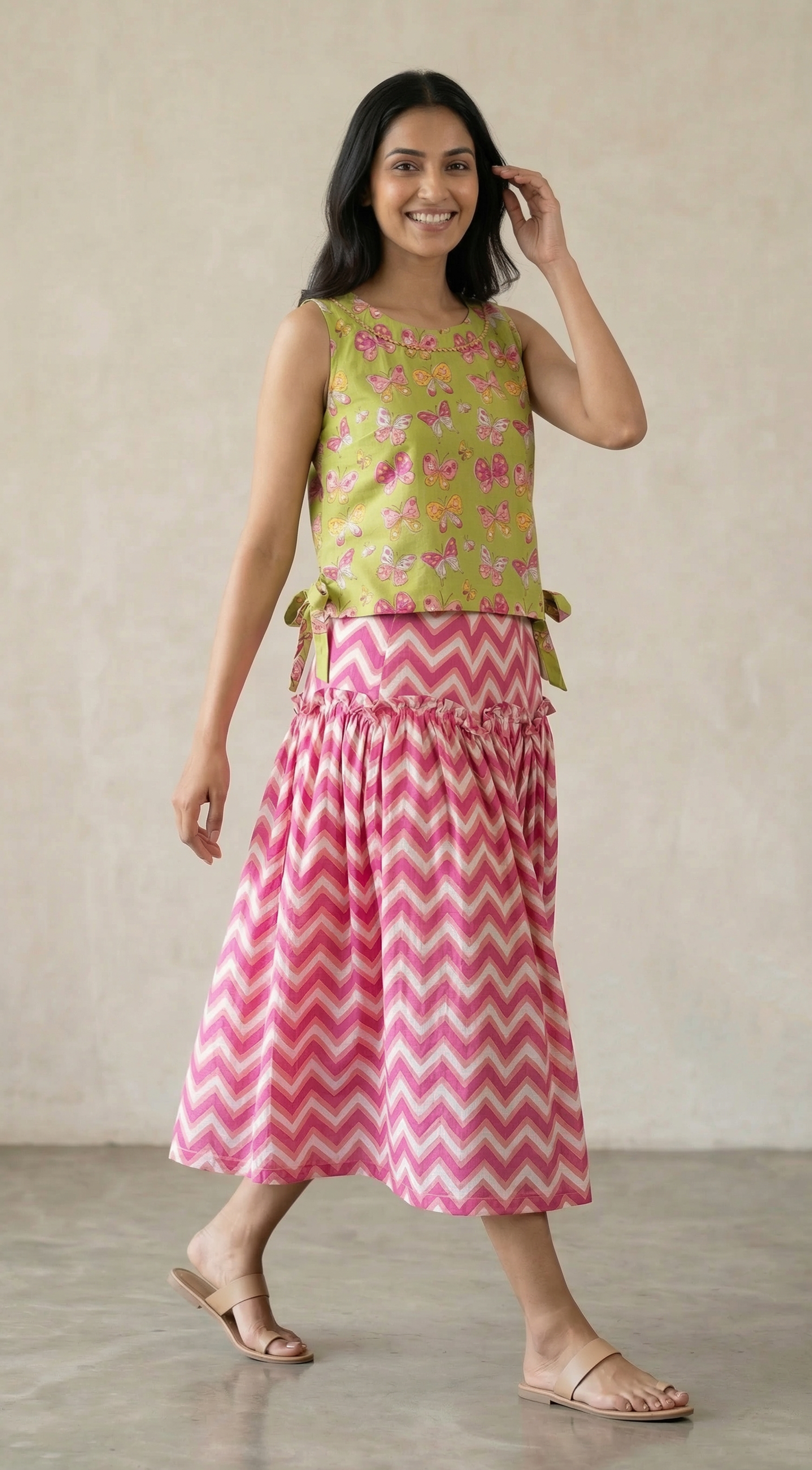 This one doesn’t wait for spring — it brings it. A crisp lime green sleeveless top scattered with hand block-printed butterflies in blush, pink and orange, each one mid-flight and full of life, tied at the sides with little fabric bows that add just the right amount of play. Below, a bold pink chevron midi skirt zigzags its way down in deep rose and blush, gathered at the hip with a ruffle waistband that gives it a joyful, almost danceable bounce. Loud in the best way. Worn for the days you want to be noticed.