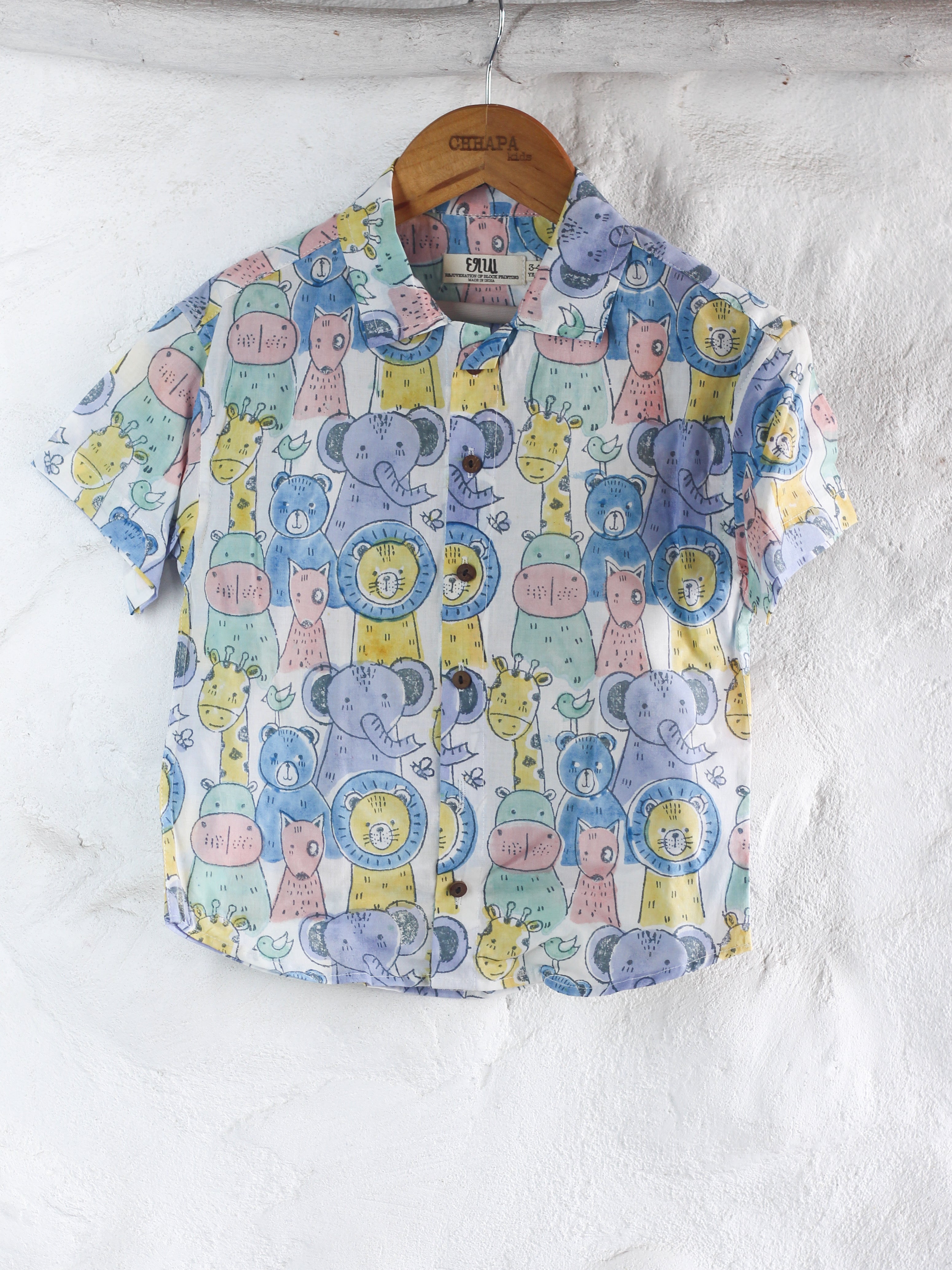This Kids Animal Safari Shirt & Short Set features soft cotton fabric for gentle comfort on your child's skin. The colorful pastel shades and hand block printed animal safari doodle design add a playful touch. The set includes a shirt and matching shorts with a super comfy loose fit, allowing your little one to move freely and stay comfortable all day. Perfect for everyday wear or playful adventures.