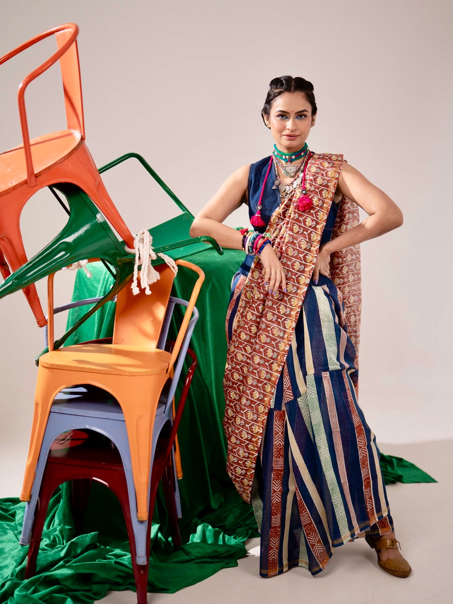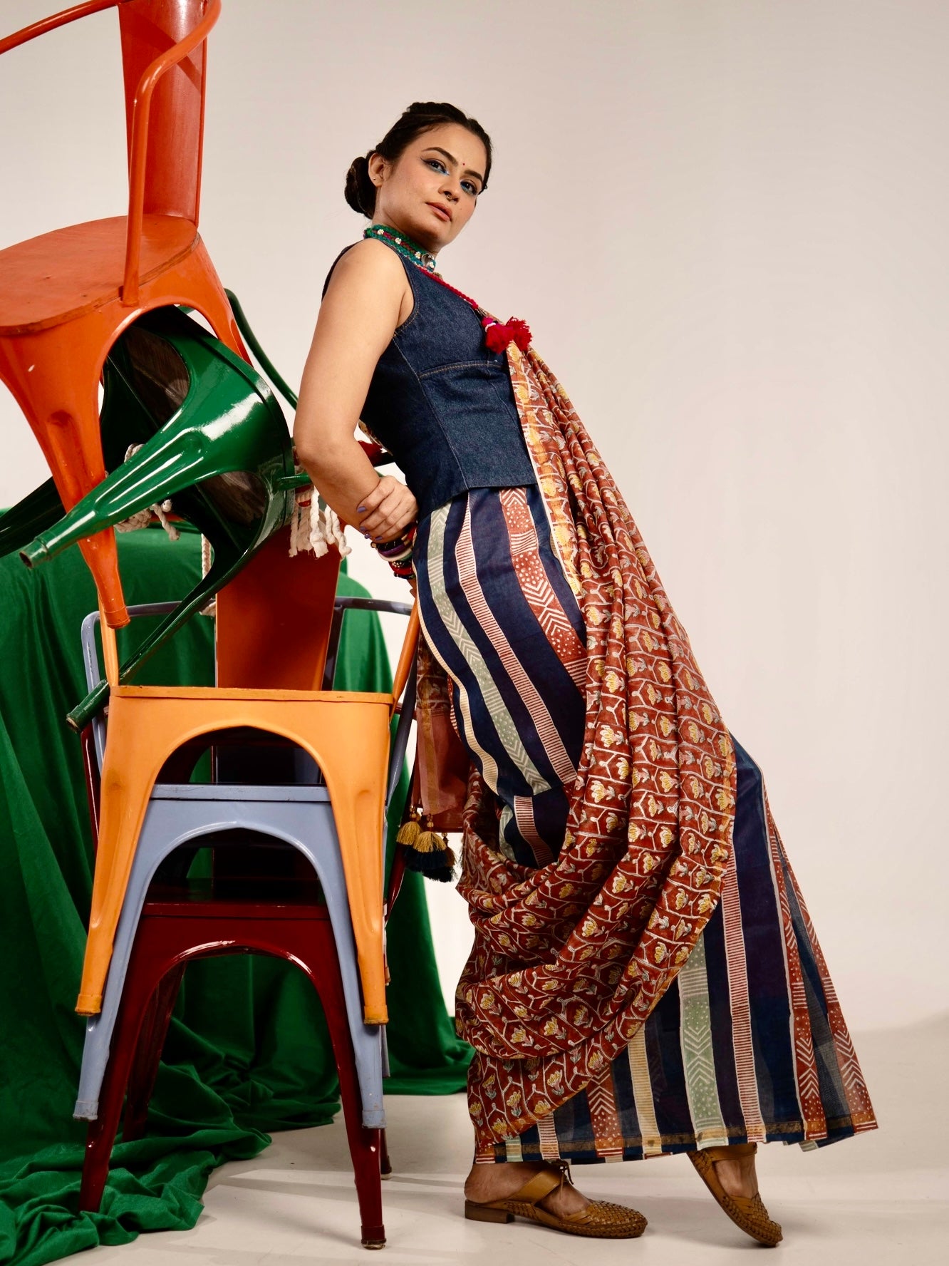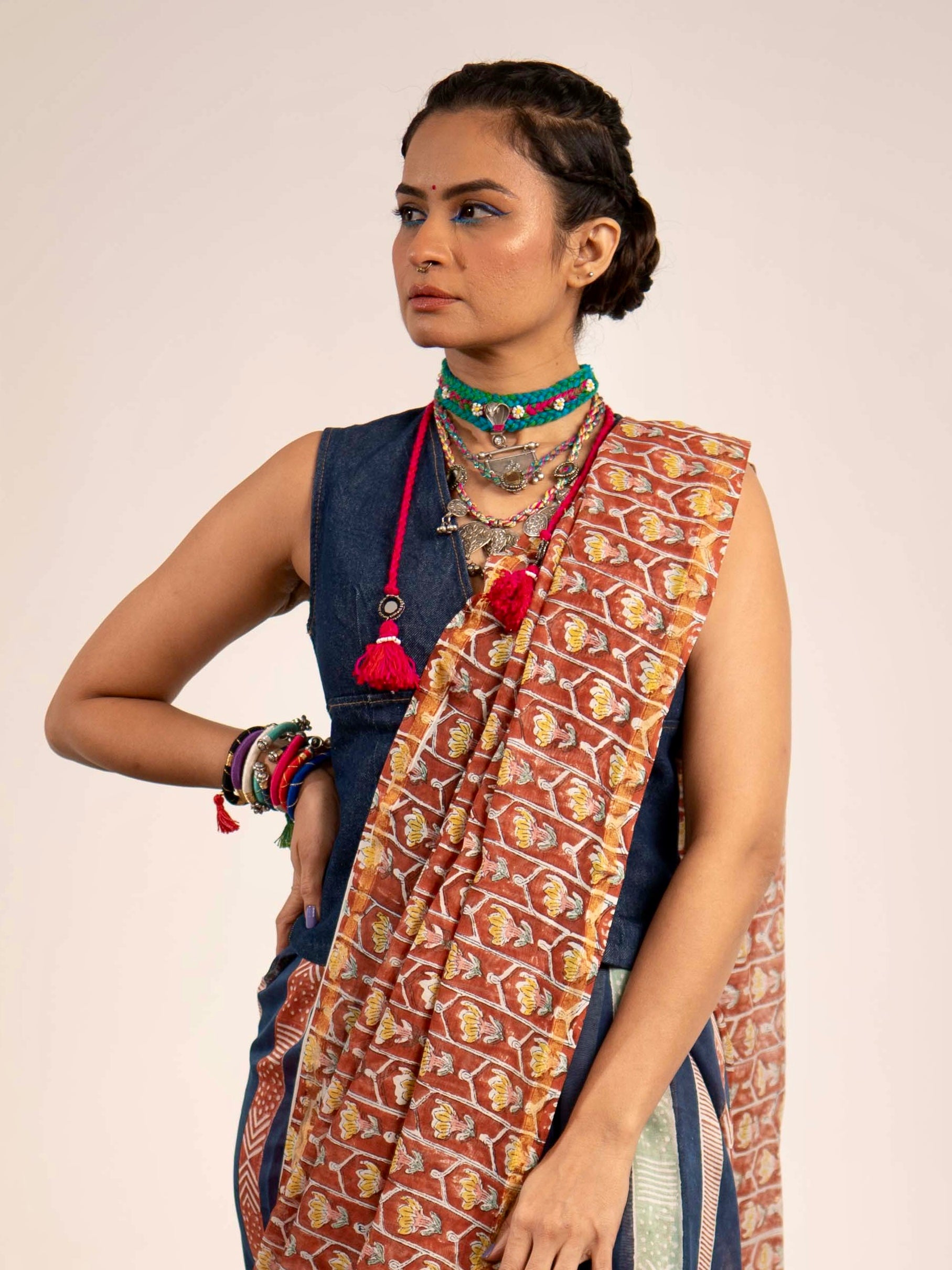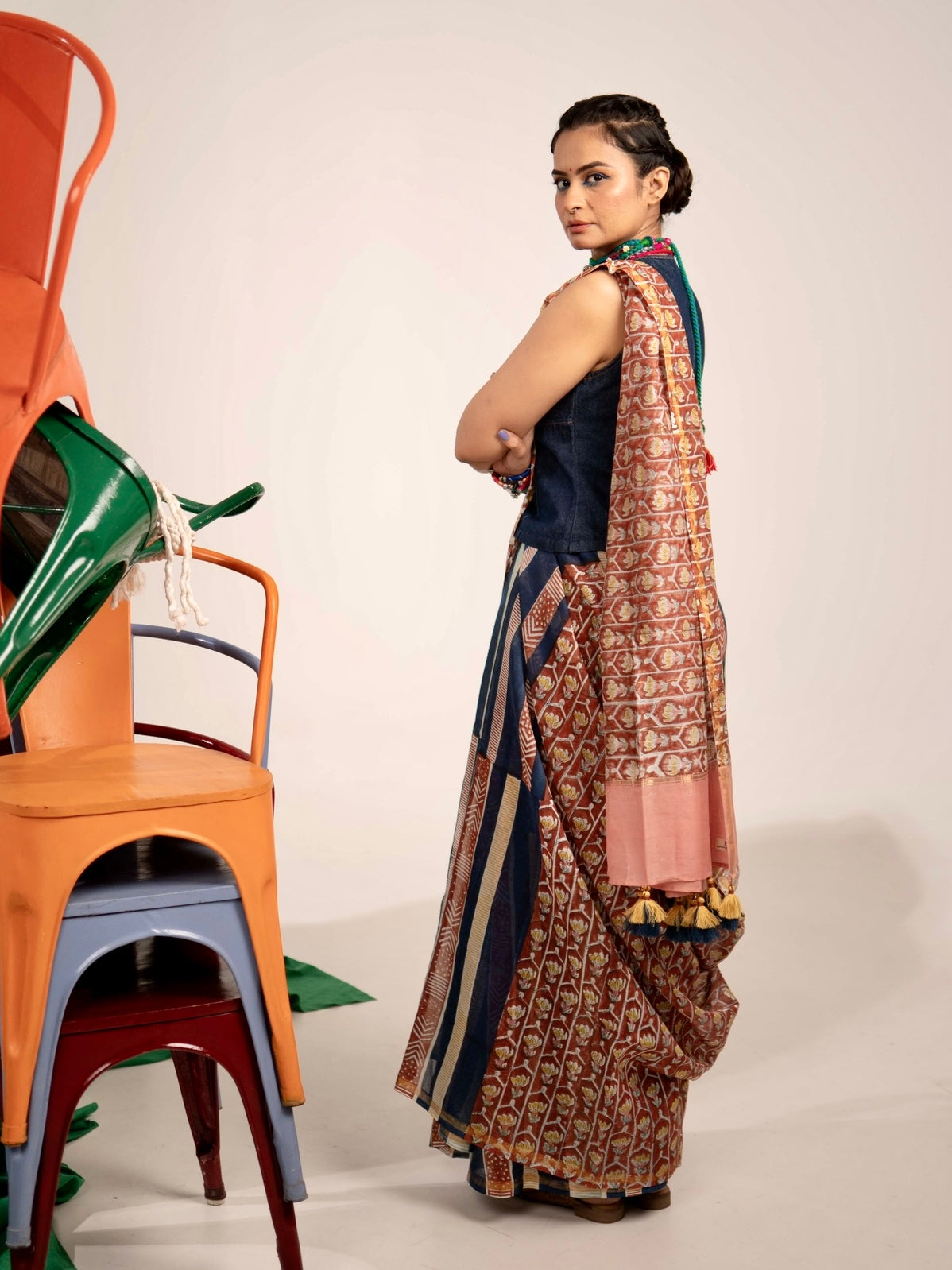 Bright, fearless, and unapologetically stylish — Tangerine Tashan is all about making a fiery statement. Crafted in elegant Chanderi, this half-and-half saree glows in a stunning rust orange shade, paired...