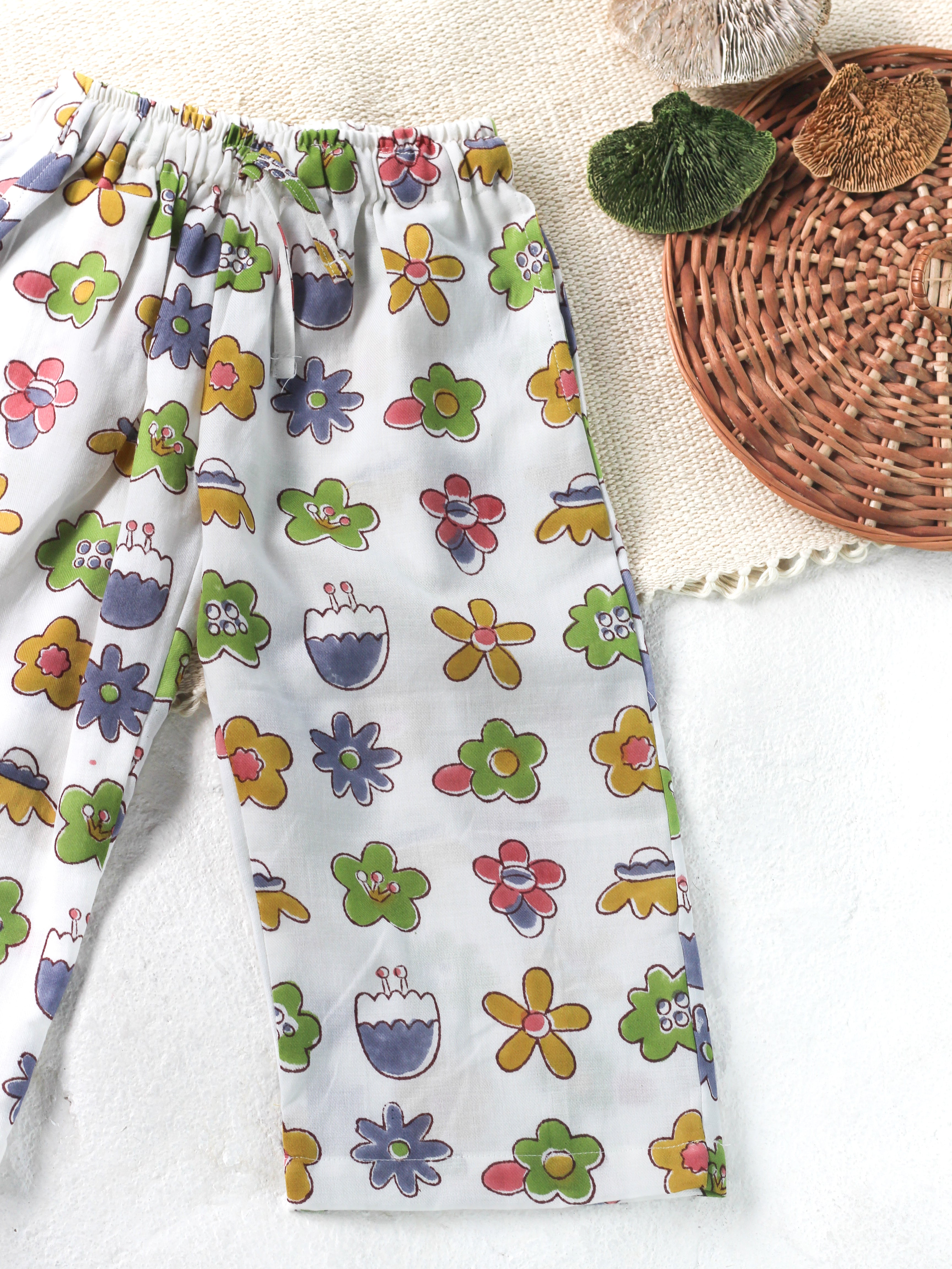 This charming two-piece ensemble features a delightful floral print on soft, breathable cotton in crisp white. Each set is lovingly hand block printed, making every piece wonderfully unique. Perfect for...