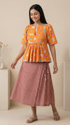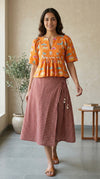 Pack light, go far. This set is for the daydreamers and Sunday drivers. A warm marigold peplum top carries hand block-printed vintage cars and vans in teal, pink and yellow — gathered at the waist with shell buttons and full of the kind of energy that makes you want to just go. It meets a rust midi skirt in a crisp diamond dabu print, grounded and earthy, balancing all that brightness beautifully. Together, they feel like the open road and nowhere to be in particular.