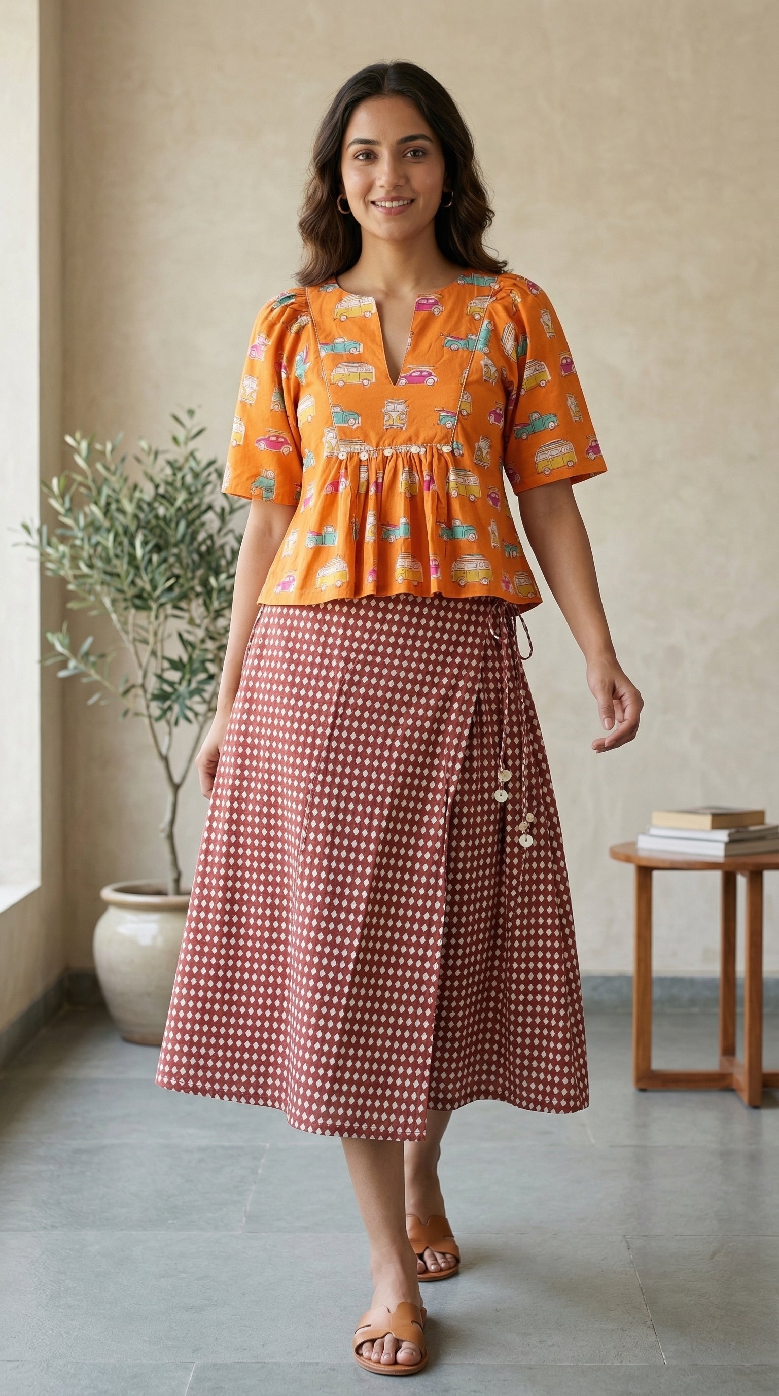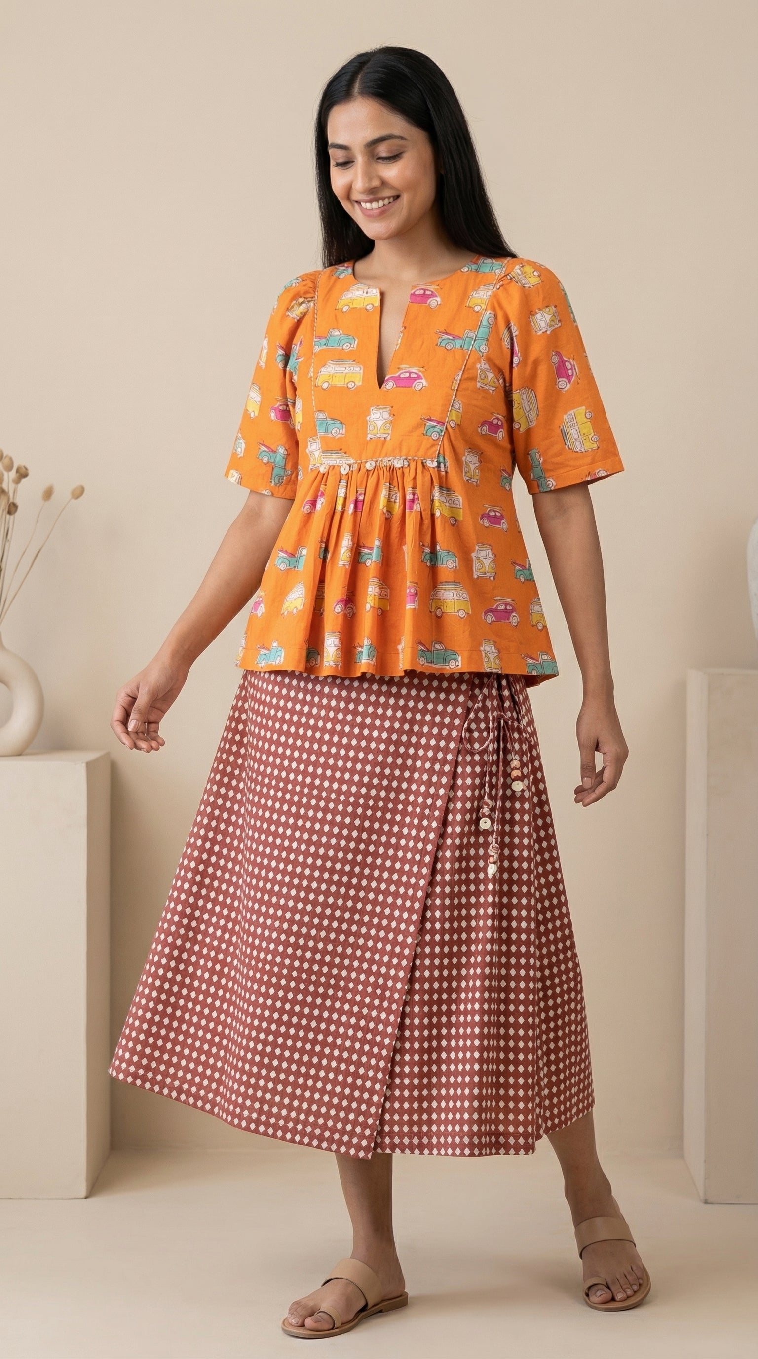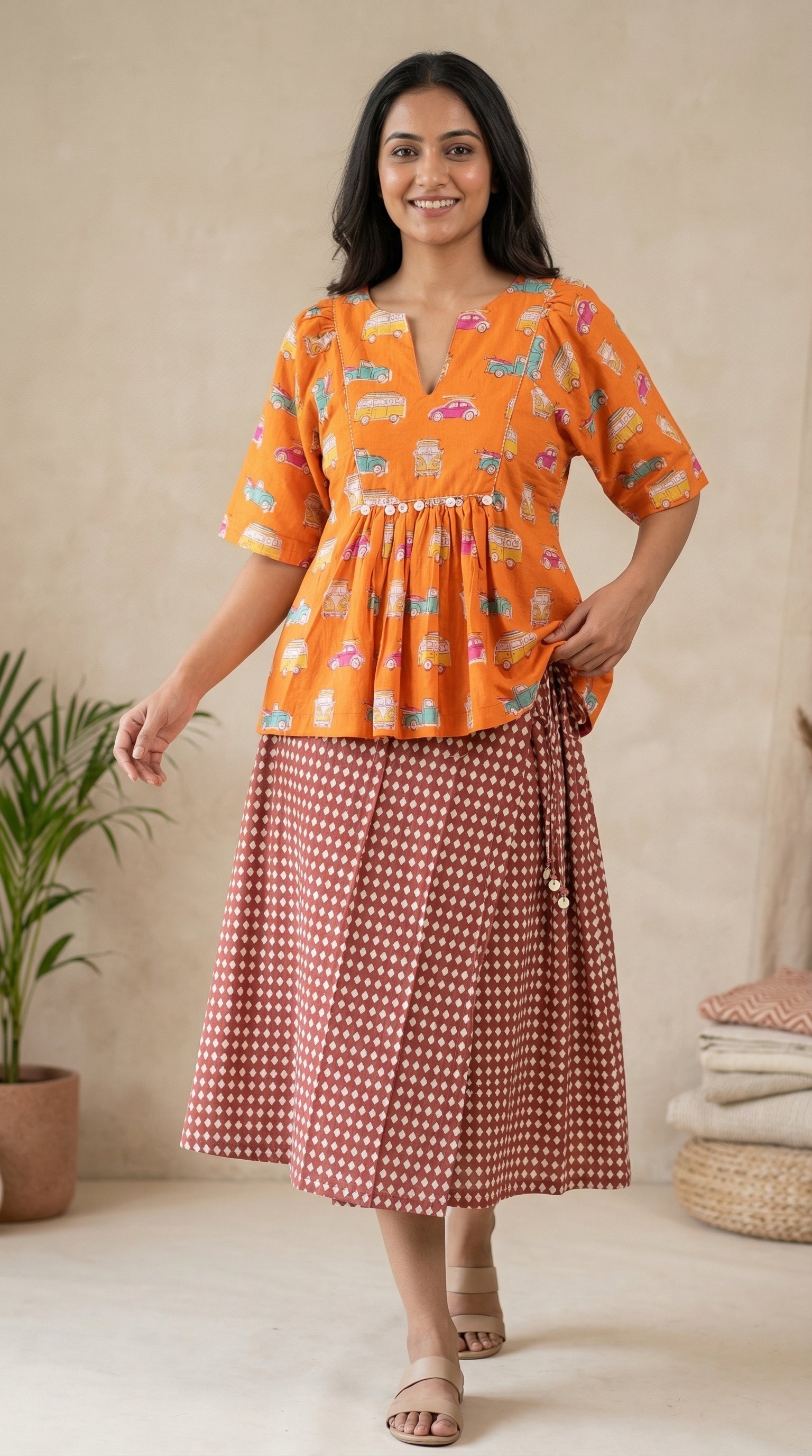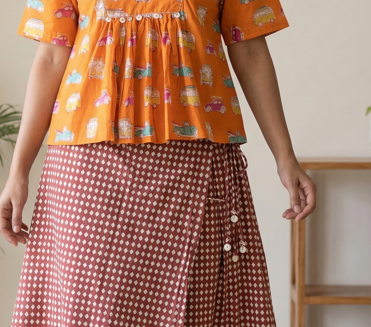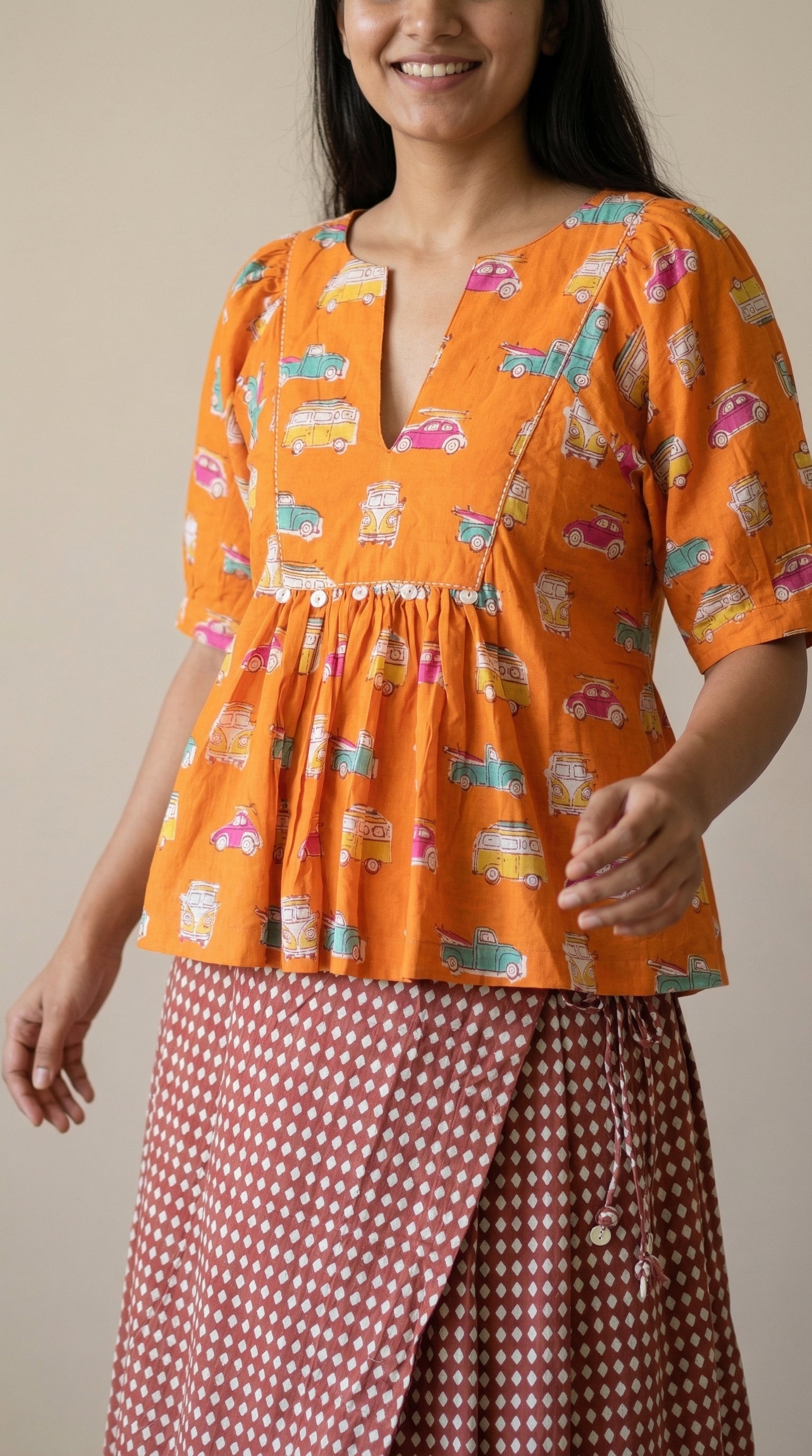 Pack light, go far. This set is for the daydreamers and Sunday drivers. A warm marigold peplum top carries hand block-printed vintage cars and vans in teal, pink and yellow...