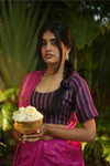Vibrant and celebratory, Phoolmala is drenched in rani pink with hand-blocked flower jaal motifs. Gold foil adds a festive gleam, while the handmade tassels complete its charm – a saree made to spread joy, much like the festivals it celebrates.
