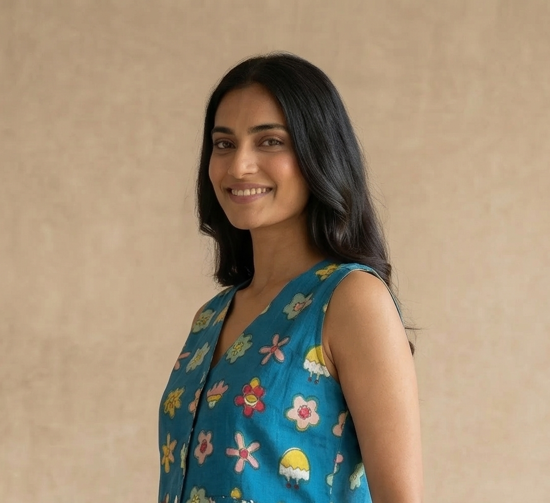 The garden called, and this set answered. A teal sleeveless vest covered in hand block-printed whimsical flowers — each bloom quirky, colourful and full of character — buttons up with shell buttons and finishes with a delicate kantha-stitched hem that gives it an heirloom quality. Paired with a forest green midi skirt in a crisp white polka dot print, gathered and flowing with a drawstring tie and coin charm at the waist. There’s something effortlessly put-together about this combination — like you found it, and it found you right back.